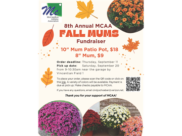 fundraiser! Choose from a 10" Mum Patio Pot for $18 or an 8" Mum for $9. A variety of colors will be available on a first come, first served basis. The deadline to order is Thursday, September 11 at https://forms.gle/rqU4FwXHiGD5iT8p8. The pick up will be on Saturday, September 20 from 9-10:30am near the garage by Vincentian Field 1. Payment is due at pick up. Make checks payable to MCAA. If you have any questions, email